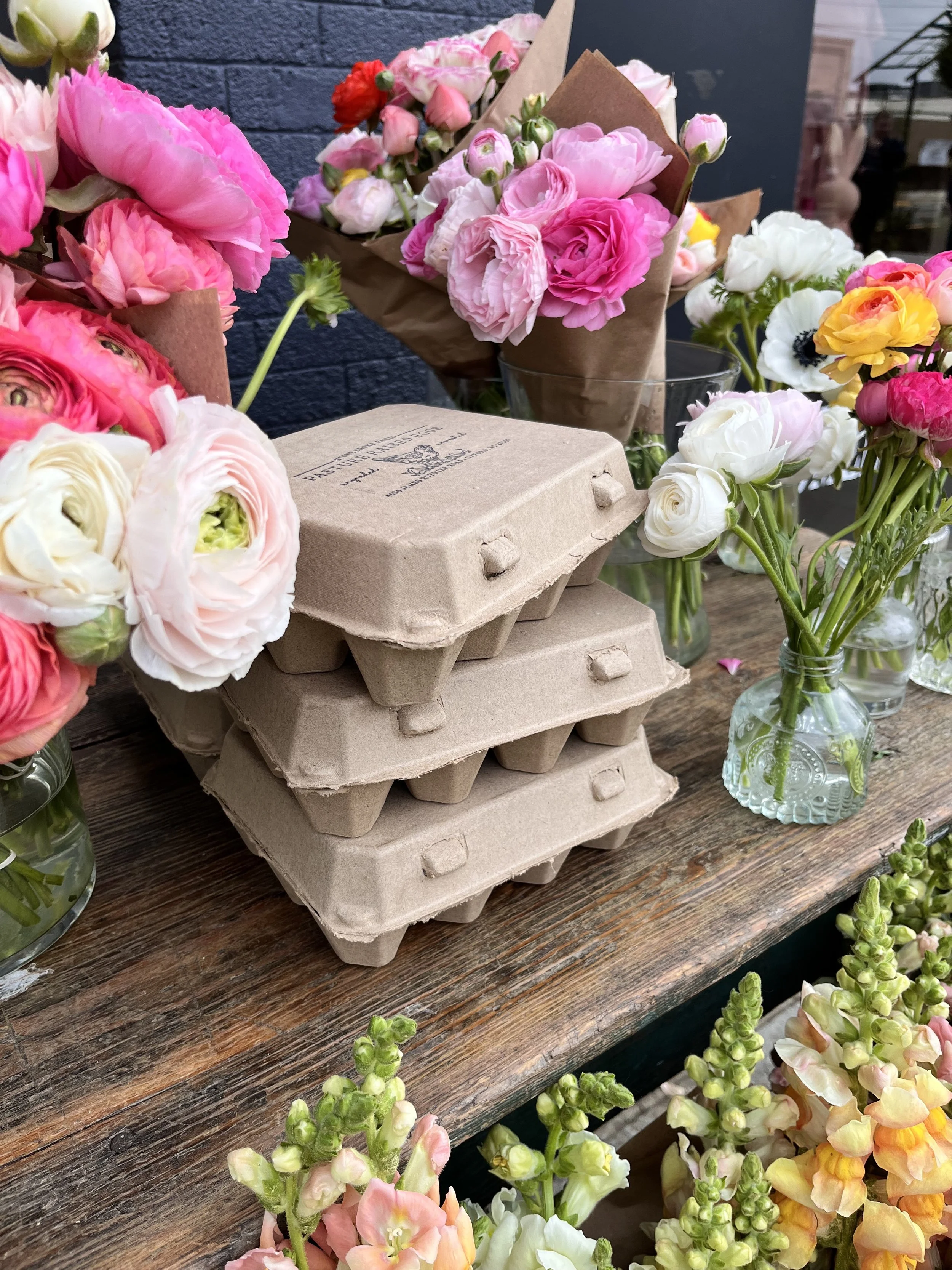 The flowers are direct from the farm. Yes, we grew them! We have two growing fields that we’ve lovingly nicknamed Sally Field and Noel Fielding. We start 90% of the flowers from seed ourselves (Some of the trickier flowers we source as plugs (Lisianthus, Bells of Ireland, Campanula). The seedlings grow in our basement before being transplanted out to the field. We don’t have a greenhouse or a high tunnel, we overwinter our flowers in low caterpillar tunnels to make sure we can bring you the earliest possible spring blooms— this sometimes means running out to blow snow off the tunnels if we get a freak storm.